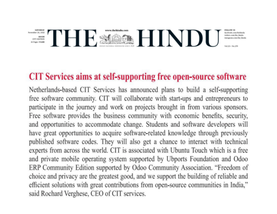 Kochi, Kerala and participants of Indicon 2022 have shown great enthusiasm towards #CIT´s vision, and some of the projects introduced by CIT (#Odoo Community Edition and #UbuntuTouch). Amazingly, the local media has picked up on this movement gaining momentum. Several articles about CIT related events have hit leading newspapers including a press meet coverage in The Hindu.
